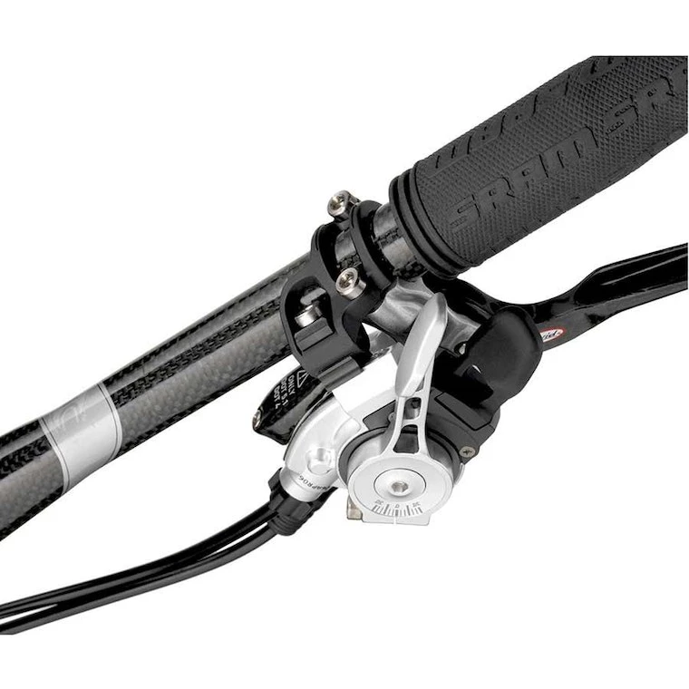 Cleans up bar space by integrating an Avid or SRAM disc brake with SRAM trigger shifters & RockShox PushLoc