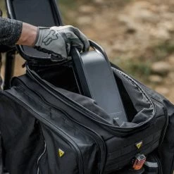 Built to go further! The E-Xplorer TrunkBag is an eBike specific spare battery carrier made of rigid EVA foam and Polyethylene providing structure, excellent impact absorption, and water repellency. In addition to the expandable top section, the side panels expand to full panniers maximizing capacity. The grip straps secure a spare battery in place while 3Mโข reflective strips and attachable rear light MOLLEcompatible strap add extra safety. Compatible with Topeakโs MTX QuickTrackยฎ 2.0 racks, thereโs even enough room to carry additional gear for your eMTB adventures!