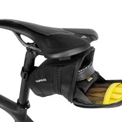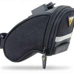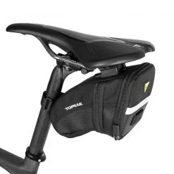 Aerodynamic seat bag holds tubes, tools and other repair items. Mounts and removes quickly with our innovative QuickClickยฎ system. Four sizes offered to exactly fit riderโs needs.