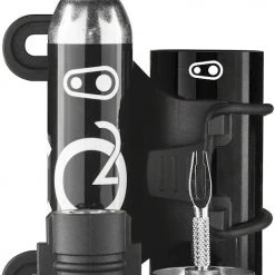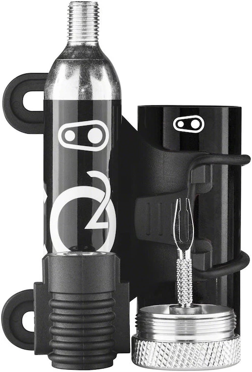 CO2 cartridge screws directly into the plunger tool, doubling as storage and a handle.