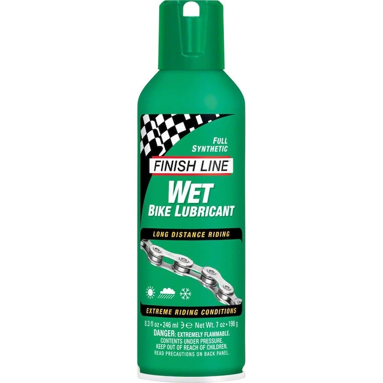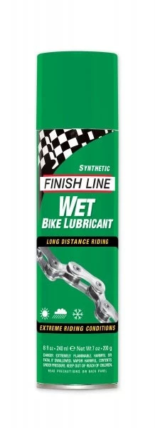Finish Line WET Lube (Cross Countryโข). An โextremeโ lube; super durable high viscosity synthetic oils, special polymers, anti-wear additives, friction modifiers, and more, all combine to make this Finish Lineโs strongest, longest lasting, most water resistant lubricant. WET Lube goes on wet and stays wet on the chain. Recommended for long-distance riding and extreme weather conditions. If you use WET Lube for riding off-road or in dry climates, be sure to wipe the excess from parts; this will help minimize the attraction of dirt and grime. Since 1994, when this lube was first introduced, it has become the preferred lubricant for many professional on and off-road teams world-wide. Use WET Lube when you ride hard and long. Proven performance for 100-plus mile rides, muddy off-road conditions, long rainy commutes, and foggy salt-air coastal climates. A heavier, wet-style lubricant that requires a little more attention to drivetrain cleanliness, but delivers the ultimate in lubricity and protection.