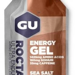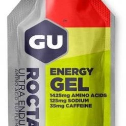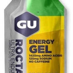 Created for demanding training and competition, GU Roctane Energy Gel stands out from original GU Energy Gel with more sodium, an electrolyte that aids in hydration, and even more branched-chain amino acids (leucine, valine, and isoleucine) that reduce mental fatigue and decrease muscle damage than our original GU Energy Gel. The amino acid taurine helps maintain heart contractility and improve cardiac output during long exercise sessions, while the amino acid beta-alanine helps promote formation of the intramuscular buffer carnosine. The 100-calorie packets contain carbohydrates (maltodextrin and fructose) that use non-competing pathways to help maximize carbohydrate absorption and utilization while diminishing stomach distress.