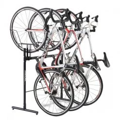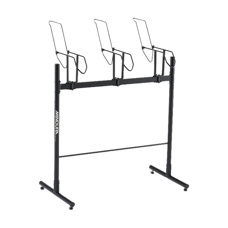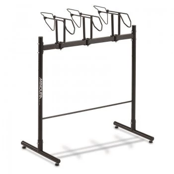 Holds three bikes by their front wheels