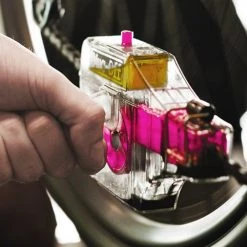 The abrasive cleaning teeth and rotating brush wheels which have 120 contact points cover all areas of the individual chain link for a deep and thorough clean. Finally the excess dirty fluid drops into a second lower reservoir so it’s kept away from the clean chain. No more recycled grime all over the chain! Muc-Off Drivetrain Cleaner is fully biodegradable and is safe to be disposed of down the drain if you previously used one of our bio chain lubes!