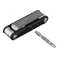 11 function, pro-quality, precision mini tool with integrated tubeless tire repair functions. Tubeless repair tools conceal within the folding tool body. Integrated tubeless tire repair tools snap into the tool body for easy handling when repairing your tire. Perfect for any road or trailside repair.