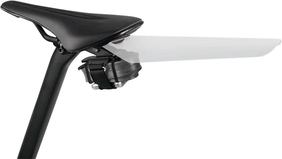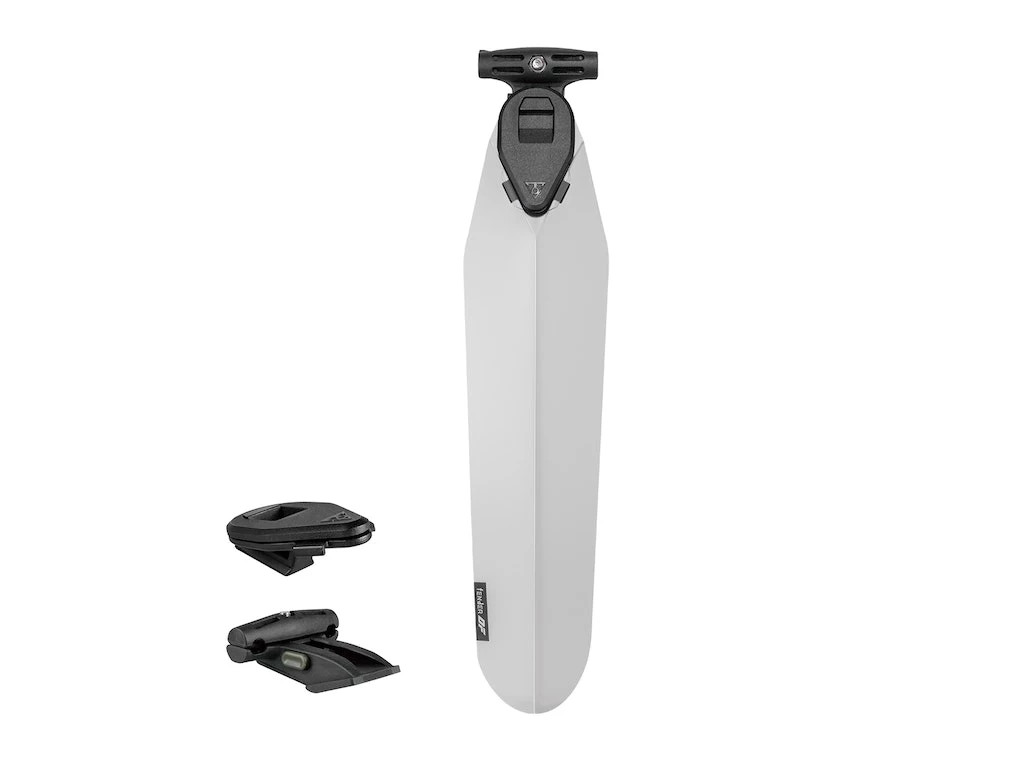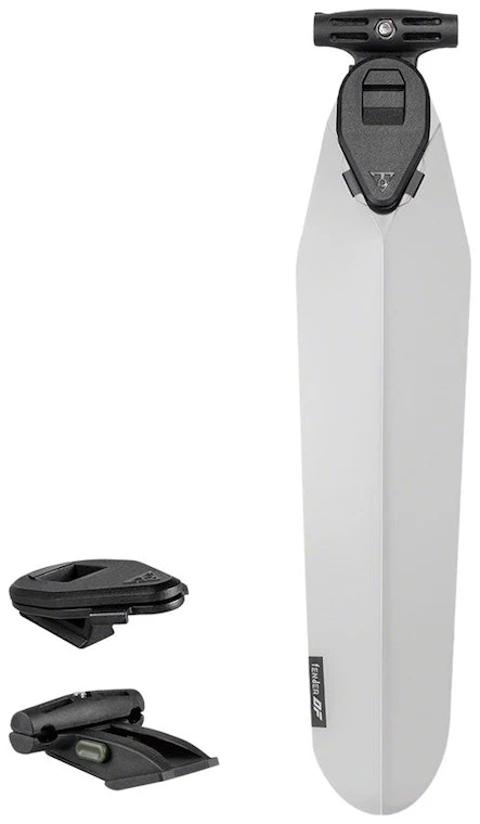Durable polypropylene fender is ultralight, stylish, and simple to slide and click then ready to go when wet weather arrives. Included Duo Fixer allows fast and easy tool-free mounting and removal and provides dual use with Topeak Duo Fixer system accessories, including Topeak QuickClick saddle bags or most strap type saddle bags, Tubi tools, CO2 inflators, and lights underneath the saddle. Black and transparent colors with exchangeable upper and lower backets as a set for the color options and mounting position option to suit different needs.