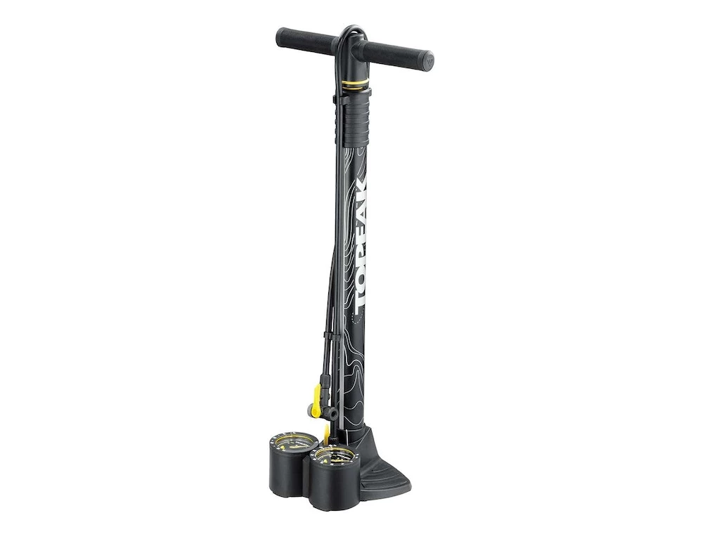 This clever dual-gauge floor pump was exclusively designed for low pressure Fat-Bike tires & moderate pressure MTB tires. A massive oversized barrel is 1.5 times larger than a standard floor pump & delivers large air volume to fill oversized tires quickly. A 30 psi (2 bar) gauge shows precise low pressure for Fat-Bike tires while the 75 psi (5 bar) gauge shows higher pressures for MTB tires. An air release button on the TwinHeadโข allows for fine-tuning pressure.